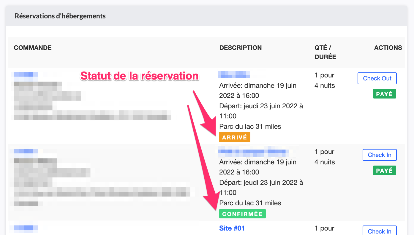 RÉSERVATIONS D'HÉBERGEMENTS - ce panneau affiche la commande faite pour la réservation de l'hébergement, sa description, la durée, la quantité et le mode Action. Ce dernier vous donnera un aperçu rapide vous permettant de savoir si votre client a payé sa commande et s'il est arrivé au site.