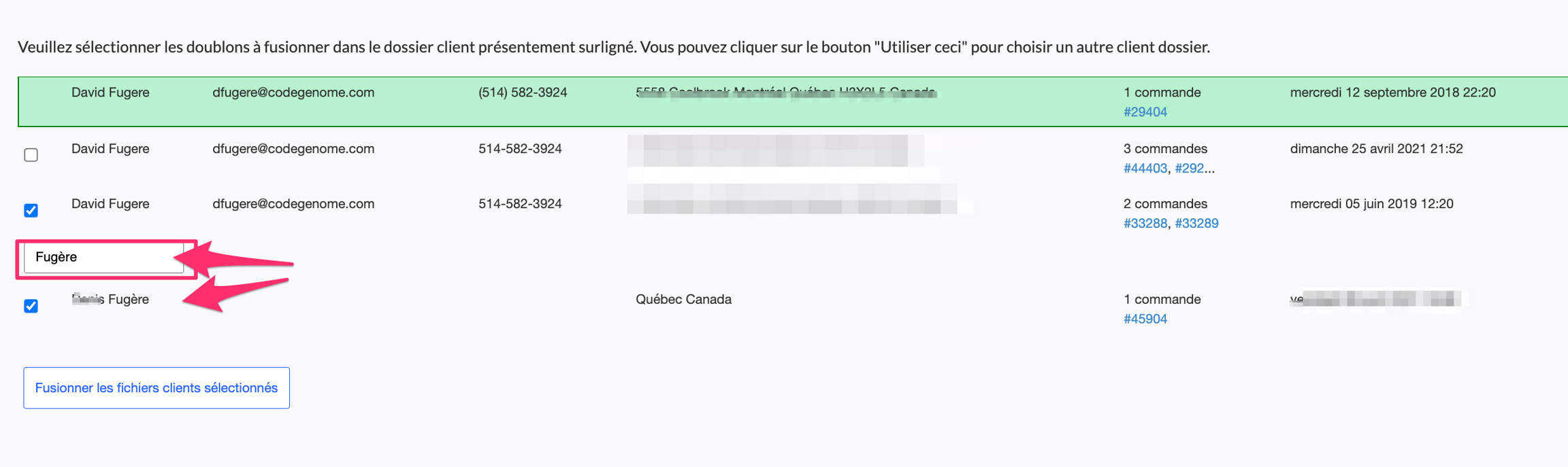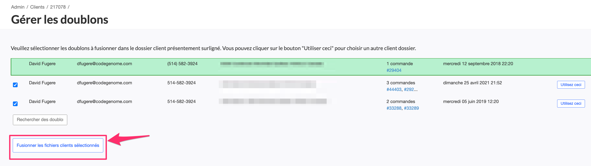 En suivant ce lien, vous arriverez à l'écran pour choisir quelles dossiers clients vous désirez fusionner avec le dossier cible. Le dossier cible sera identifié en vers. Vous n'avez qu'à sélectionner les dossiers à fusionner et les informations de chaque dossiers seront envoyée dans le dossier cible. Les informations envoyées sont les commandes, les commentaires ainsi que les courriels envoyés.