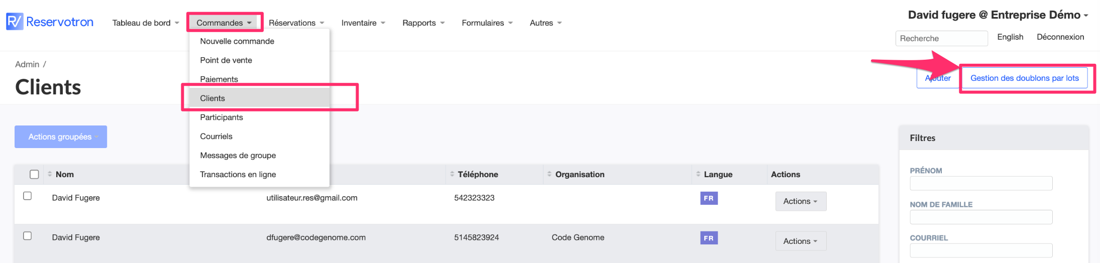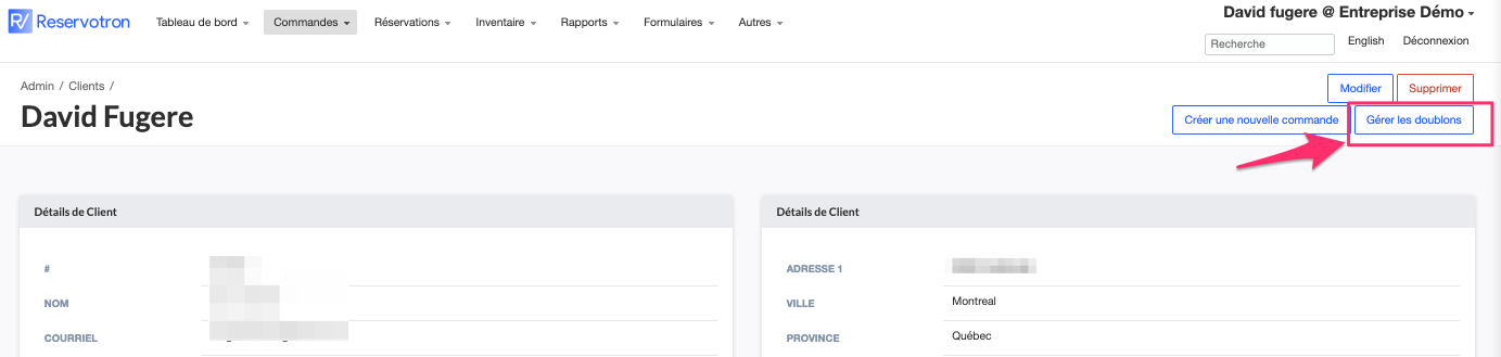 Si vous utilisez Reservotron depuis longtemps, vous aurez probablement plusieurs doublons de dossiers clients. Reservotron vous permet de fusionner automatiquement tous les dossiers clients qui ont la même adresse courriel ainsi que le même numéro de téléphone.