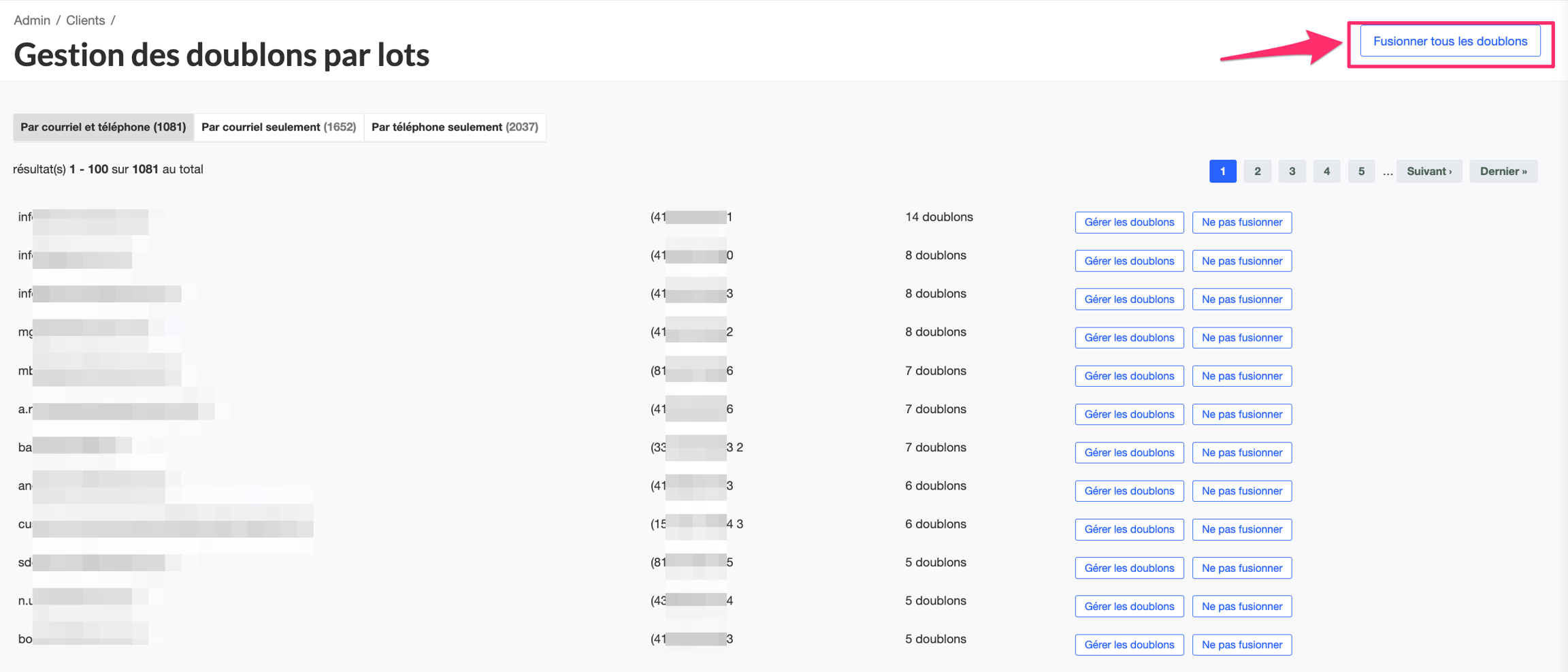 Vous pourrez accéder à la gestion des doublons par lot via un lien en haut, à droite de la liste des clients. voir: